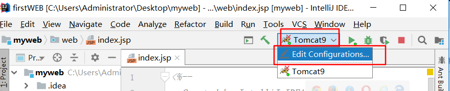 在创建好tomcat后,可以通过工具栏快速打开tomcat的配置页面: