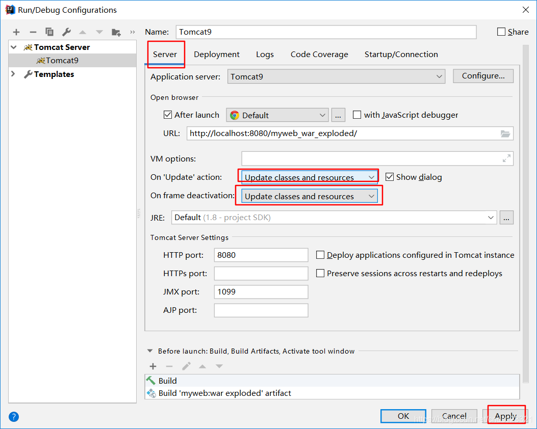 回到Server面板,将On 'update' action和On frame deactivation(这两个选项是tomcat配置了项目后才有的)改为update classes and resources -> Apply