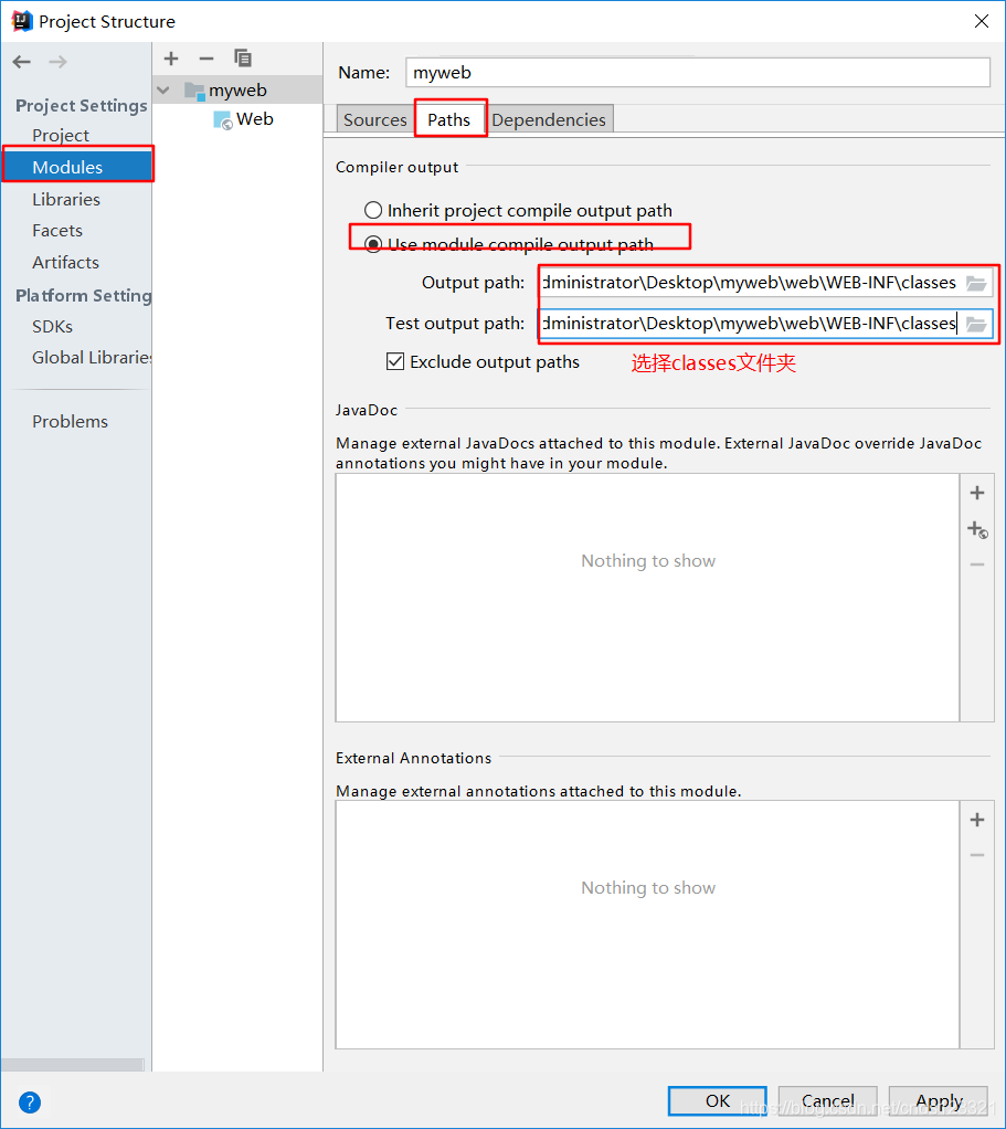 -> 选择Paths -> 选择“Use module compile out path” -> 将Outputpath 和Test output path 都设置为刚刚创建的classes文件夹