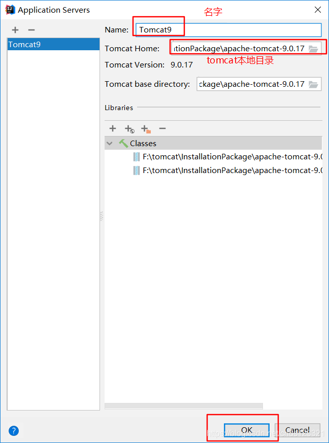 在Name出输入新的服务器名,点击 "Application Server" 后面的 "Configure...",弹出Application Servers窗口,在Tomcat Home 选择本地安装的tomcat目录 -> OK