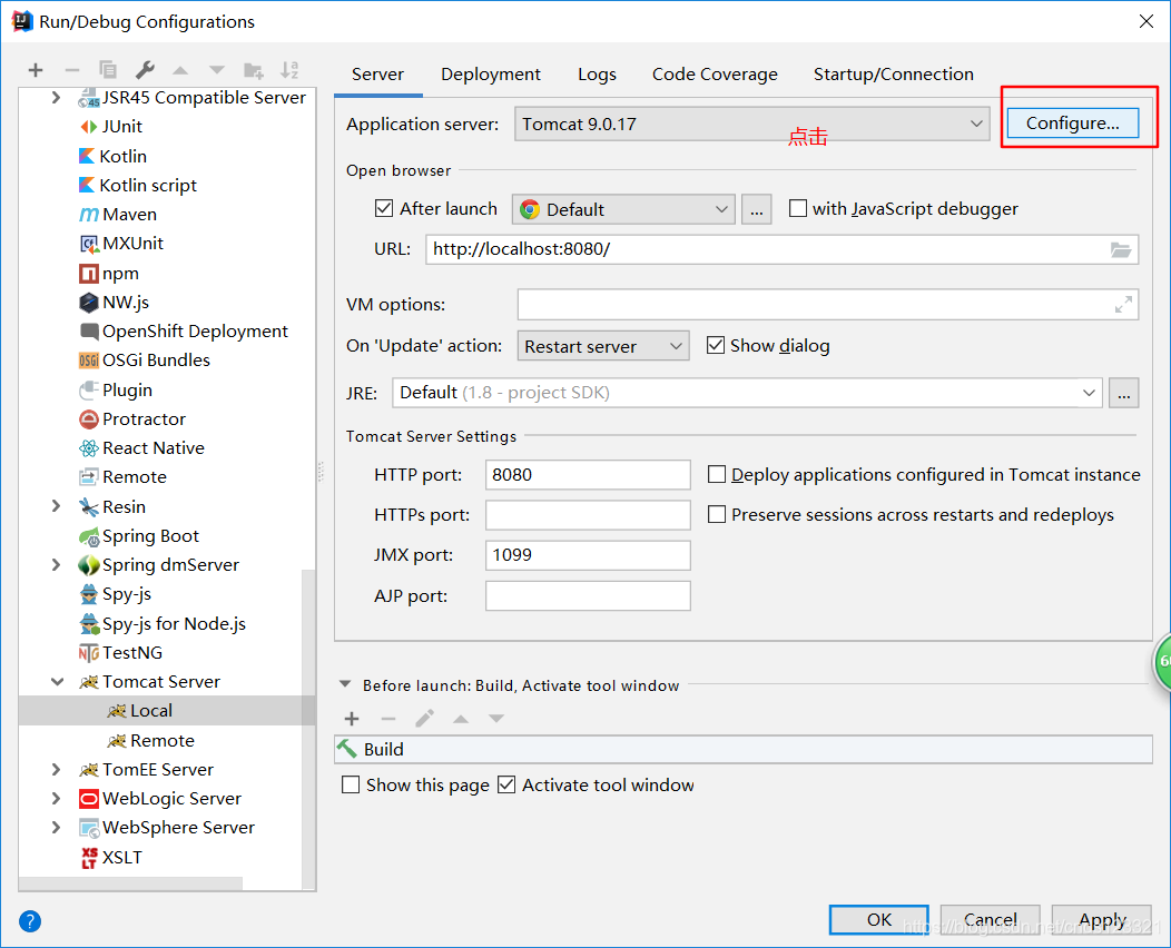 点击 “+” ,选择 “Tomcat Server” -> 选择“Local”