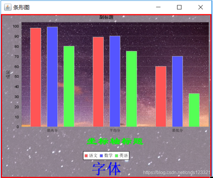 本文介绍如何使用JFreeChart库在Java中创建条形图。通过具体实例,展示了数据集的设置、图表的创建及个性化配置,包括字体、颜色、背景图片等。同时,文章还介绍了如何设置图表标题、副标题以及坐标轴的属性。