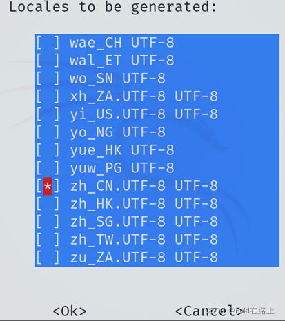按下方向键或鼠标滚轮定位到zh_CH.UTF-8 UTF8,按空格键显出星号,回车,选择缺省区域设置。