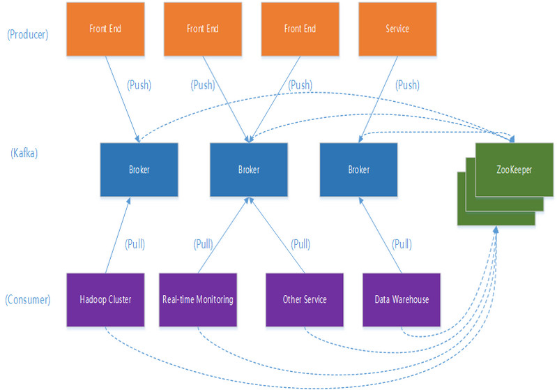 Kafka通过Zookeeper管理集群配置及服务协同,Producer使用push模式将消息发布到broker,Consumer通过监听使用pull模式从broker订阅并消费消息。