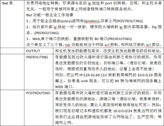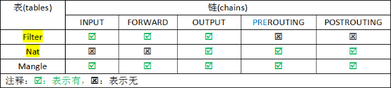 描述完iptables术语后,相信大家对iptables的表和链有了初步的了解。默认情况下,Iptables根据功能和表的定义划分包含三个表,filter,nat,mangle,其中每个表又包含不同的操作链