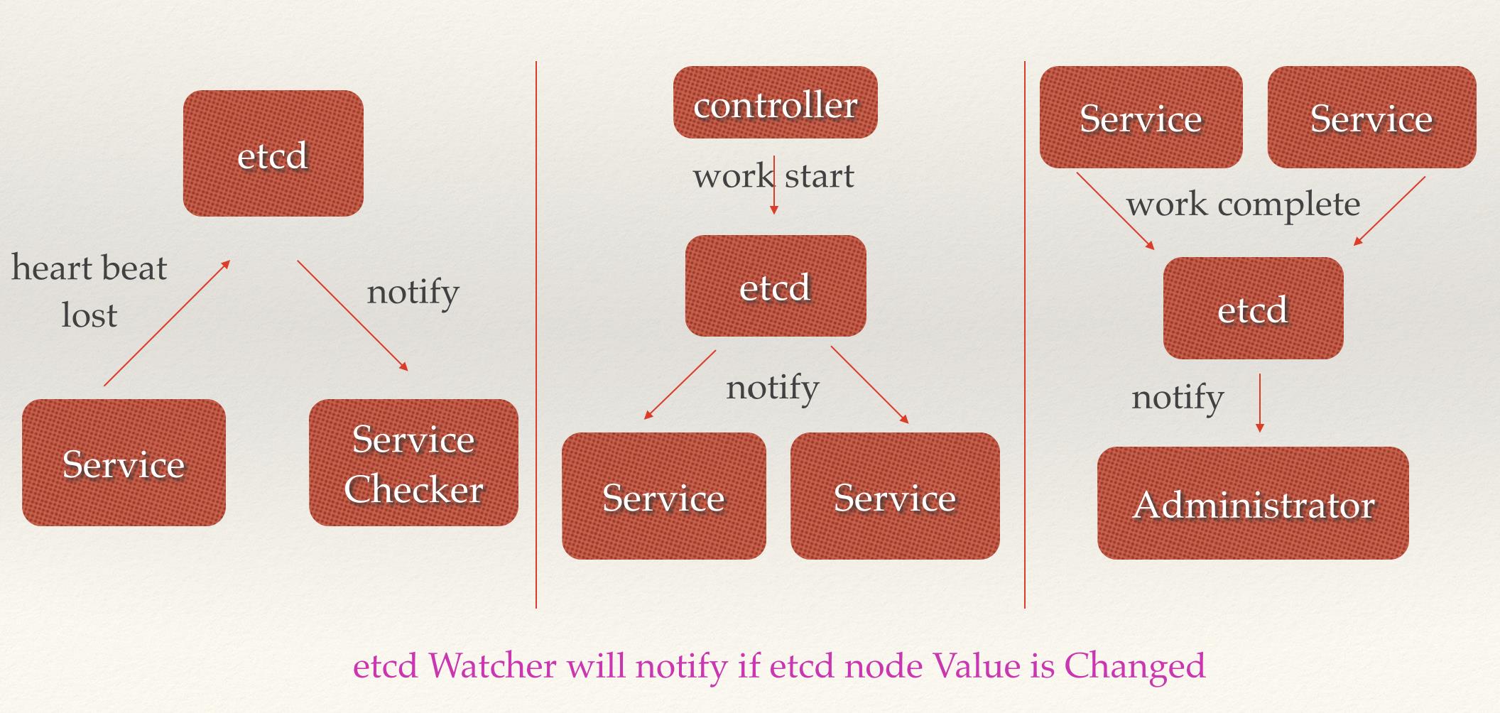 - 一种注册服务和监控服务监控状态的机制。用户可以在etcd中注册服务,并对注册的服务设置Key TTL, 定时保持服务的心跳以达到监控监控状态的效果。