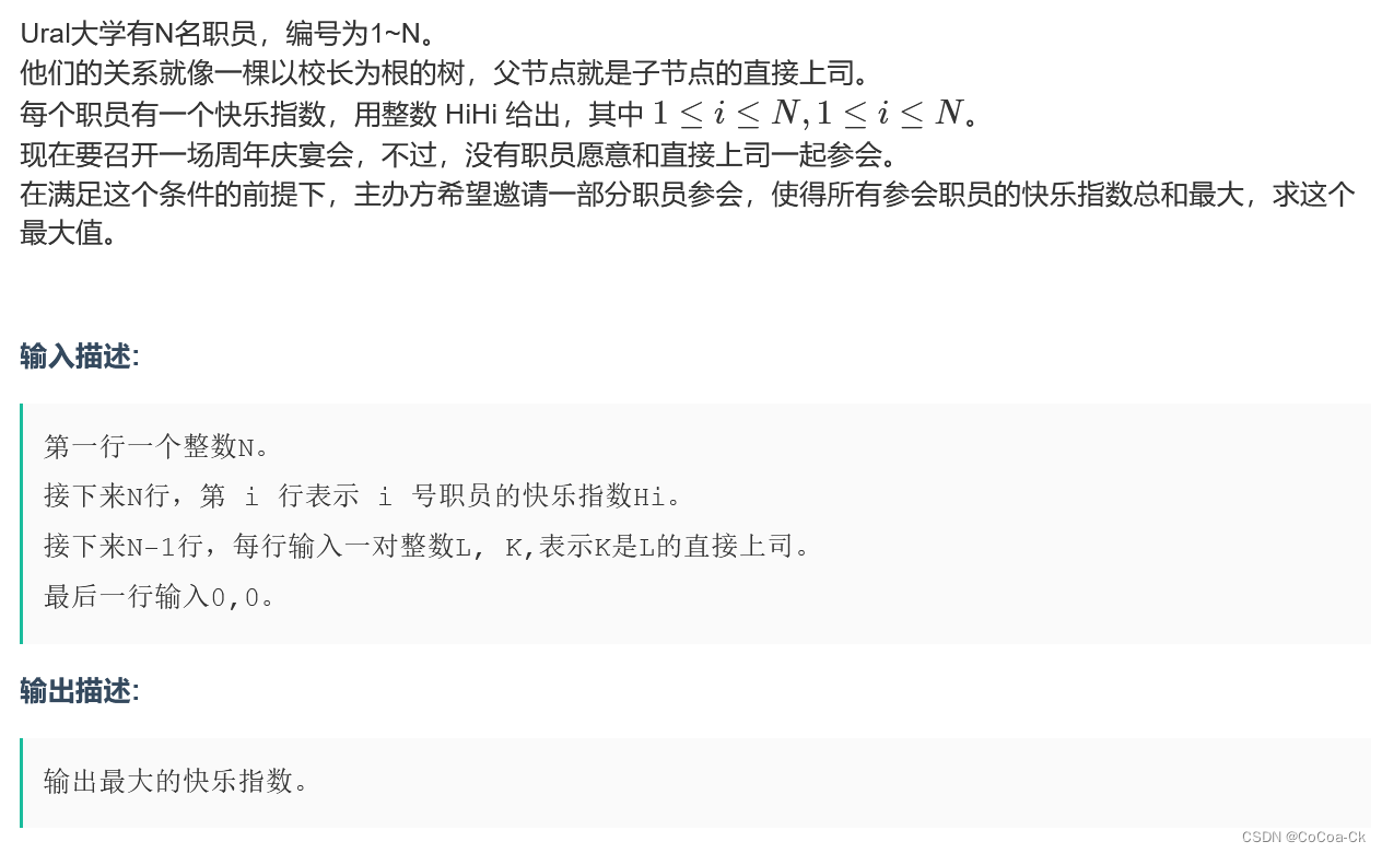 我们令f[i][0]表示i节点不选时它和它的子树快乐最大指数,f[i][1]表示i节点选时它和它的子树快乐最大指数,因此,我们得到状态转移方程为:
