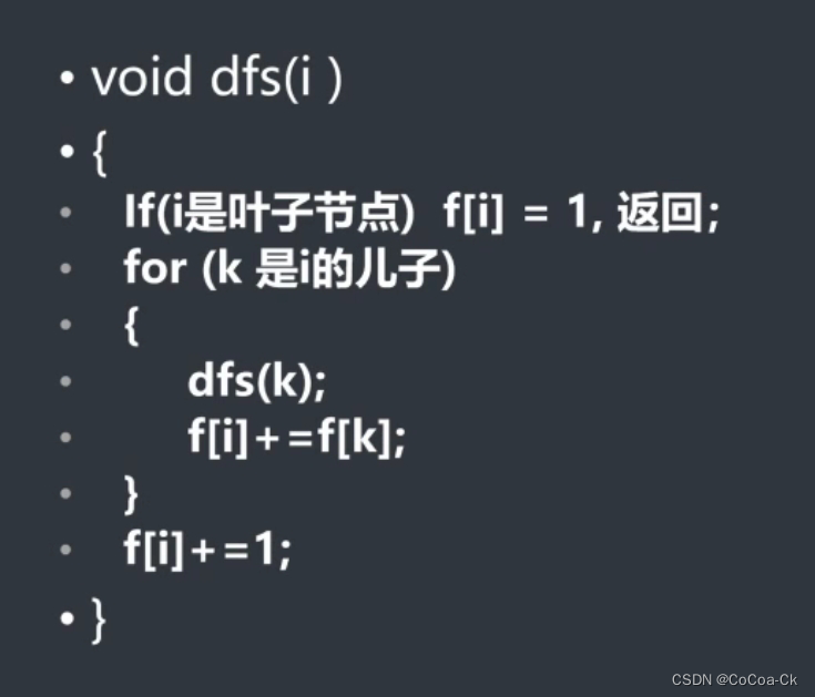我们令f[i]表示以i为根节点的子树大小,易得状态转移方程为: