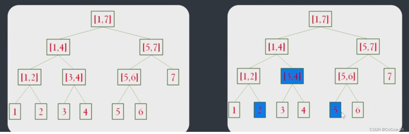 3.任意的线段[a,b]在查询过程中最多分为log(b-a)个。