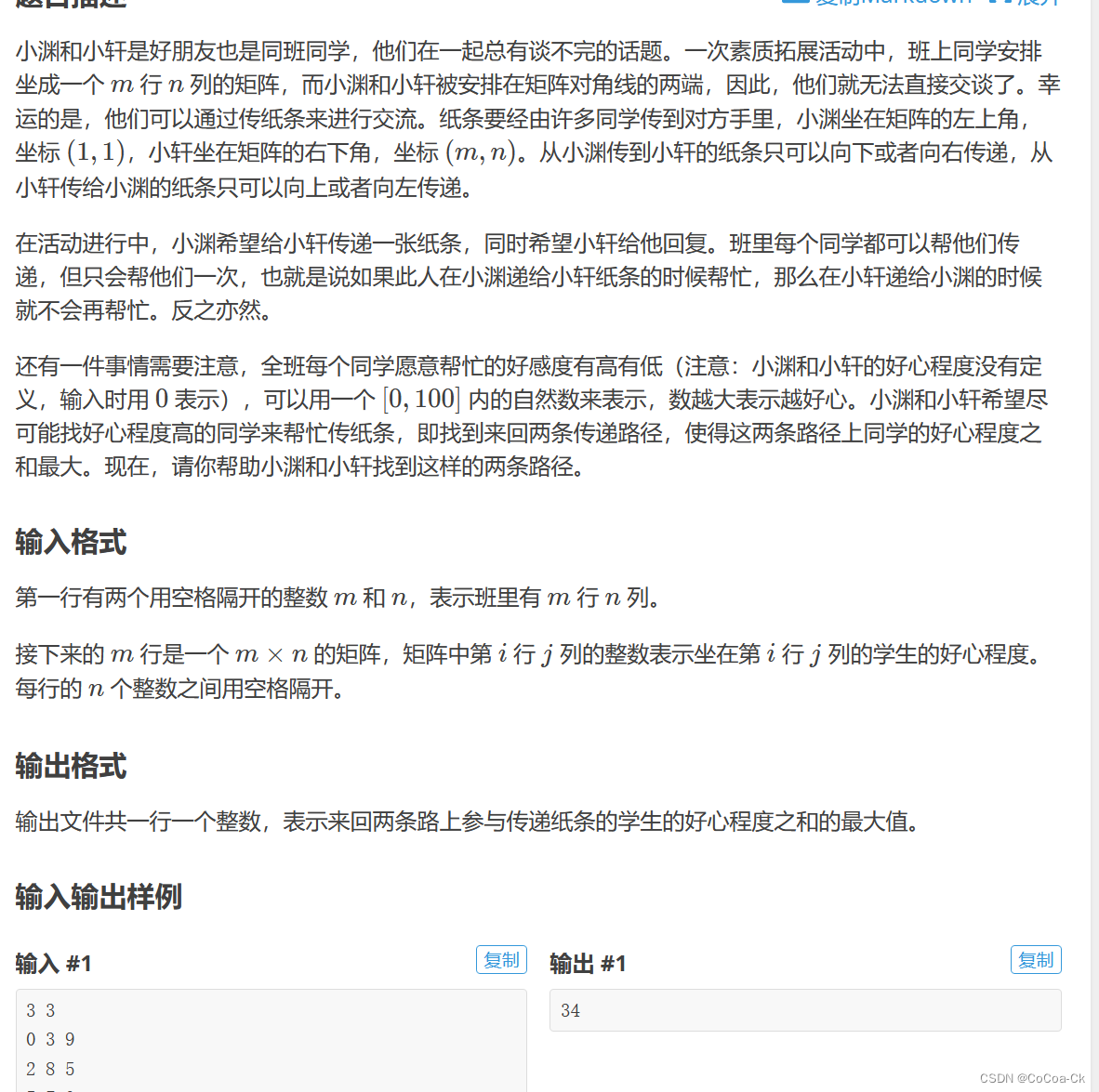 我们选另一种思路:我们可以把问题看作A同时向B传2张纸条,我们令f[i][j][m][n]表示一张纸条在(i,j),另一个在(m,n)时的最优值,这样就满足了无后效性。