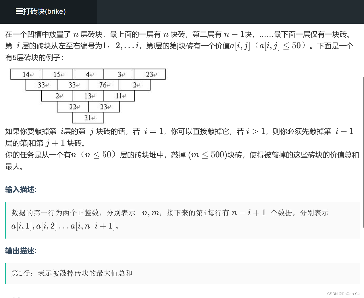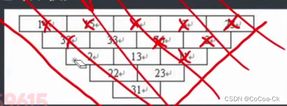 我们发现,在斜着的一列,要敲某一个则必须把他斜上方的都敲了,因此,我们一定是敲的靠上的斜着的某一段。