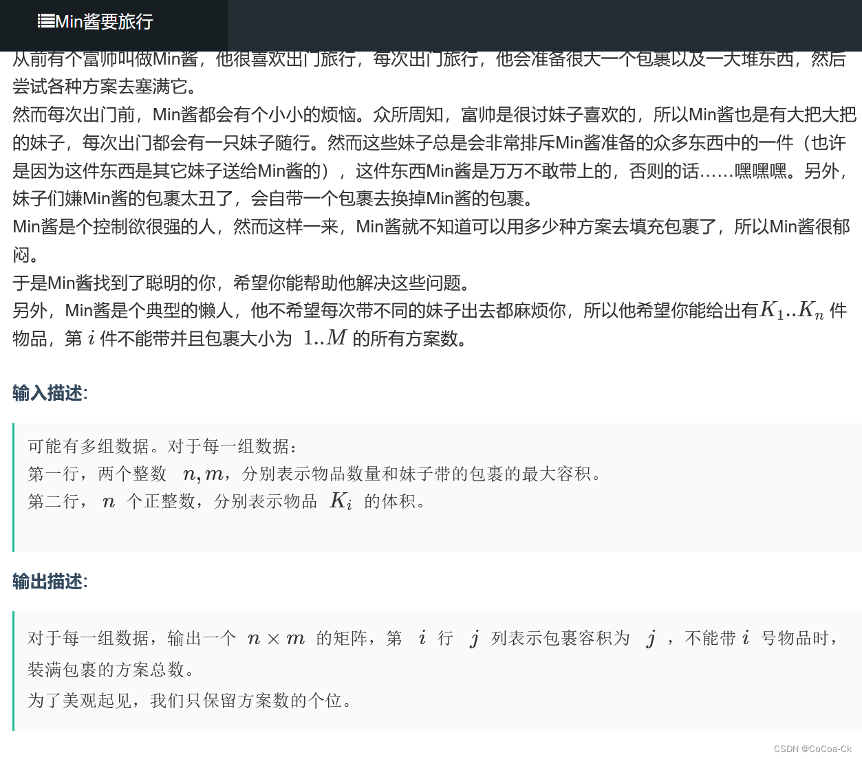 我们自然地想到用g[i][j]表示第i件物品不能带,背包大小为j的方案数。