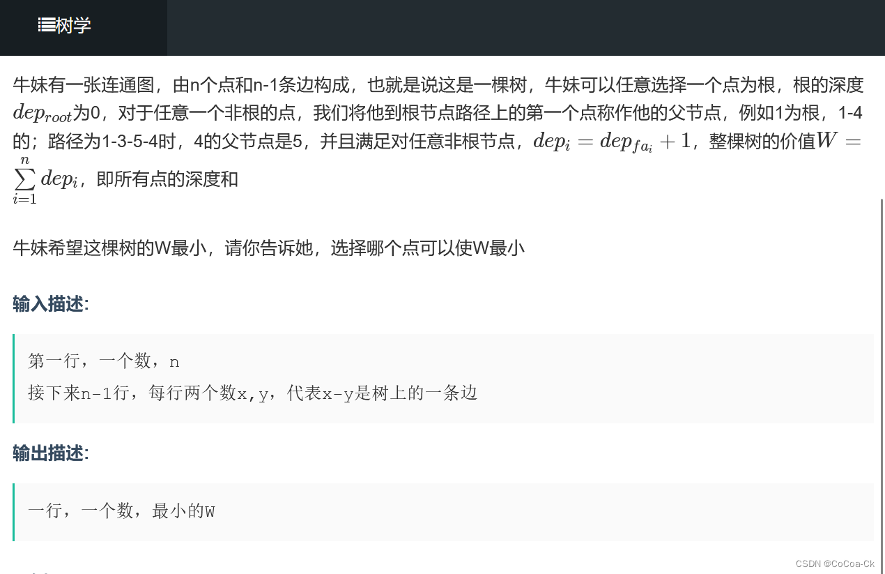 我们肯定不能对每一个根节点暴力求,我们不妨先求f[1],我们发现当他的儿子作为根节点时深度和为f[1]+(n-cnt[i])-cnt[i](cnt[i]表示以i为根的节点数),这样子两遍DFS即可,下面是AC代码: