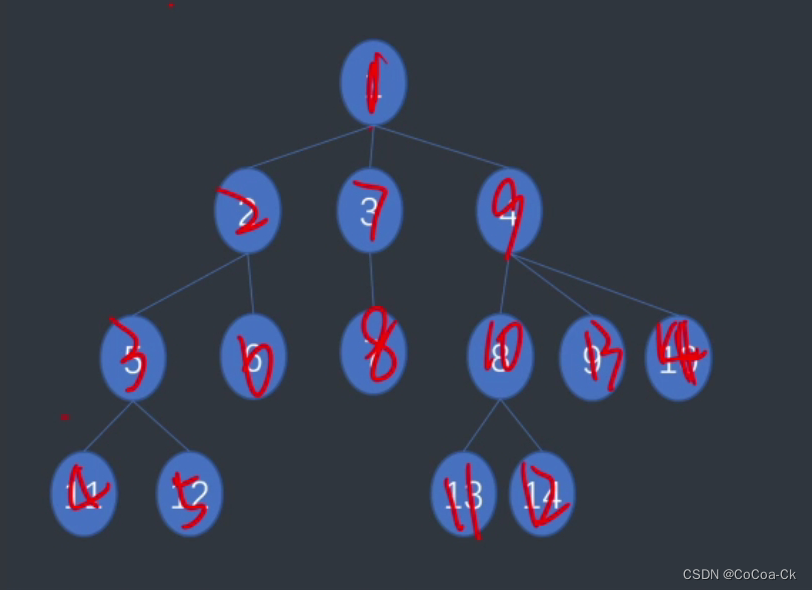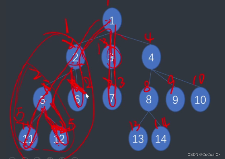 首先,一开始每一个点的fa都是自己,然后遍历到11,它没有儿子,设置11为已遍历并指向5,然后到12,此时若有11与12的询问就是11的fa,标记12并到5,5指2并标记,依次类推即可