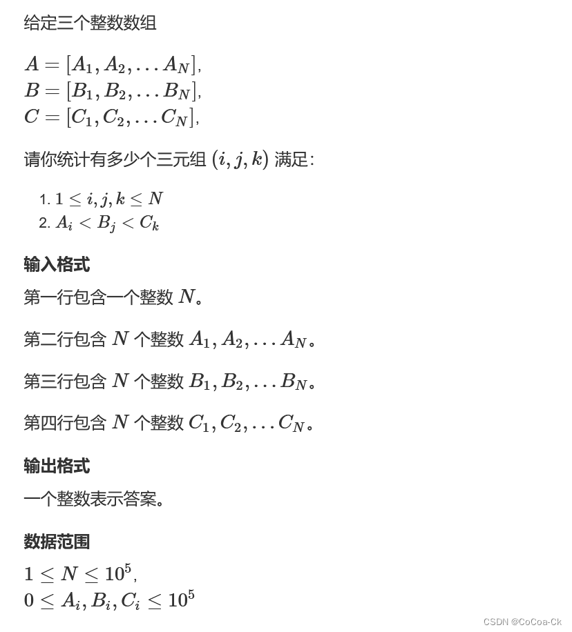弄个桶排序枚举一下即可,不过注意一下我们枚举B,这样子A与C就都可以被限制了。