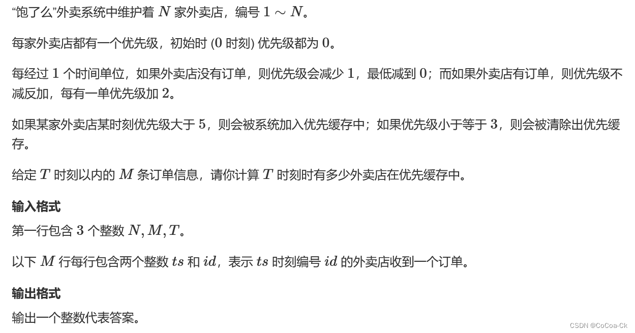直接模拟就是n*m的复杂度,TLE是铁定的,我们不妨先让它欠着债,到要处理它时先还债,债还了在继续操作,因此我们需要维护它上一次的时间,它是否在缓存中,它上次的优先级大小。