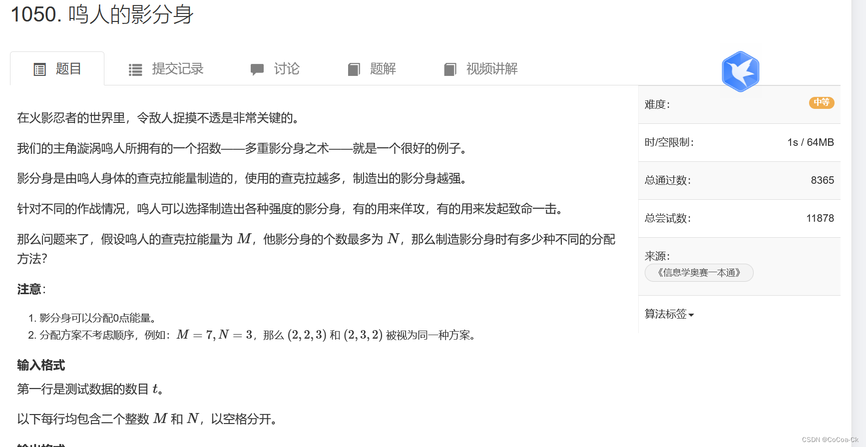 题意很简单,就是求一个数被拆成n个数的方案,肯定有人说用隔板法,但是这里223与232被视为一个方案,但是隔板法就是认为这是两种情况,于是我们令f[i][j]表示分成j个数,当前值为i的方案数,那么我们如何转移?