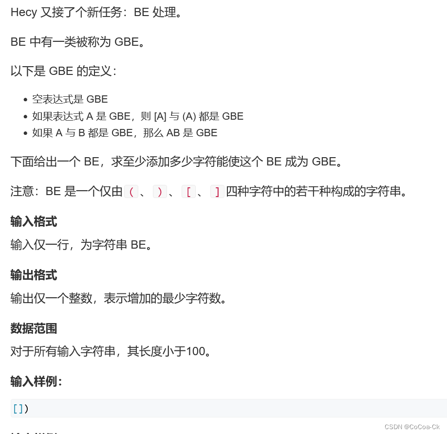 就是求最大括号对,我们令f[i][j]表示将[i,j]变成合法括号序列的方案的集合的添加数量min,