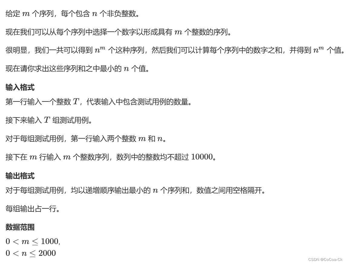 我们考虑一行一行合并,一共m次,我们合并两个并取前n小,那么我们怎么取?