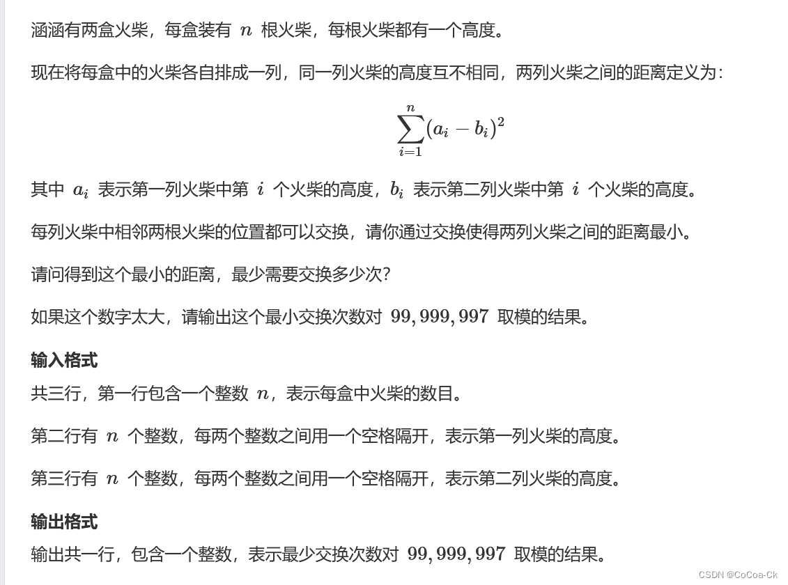 首先,两个数都从大到小排这样对于就是min,我们先考虑A1234B3241(离散化后)我们假设A不动,那么答案就是B的逆序对的数量,假如A可以动?因为此时两个逆序对之差就是B的逆序对,而假如要凑出答案,那么他们的逆序对一定为0,而每一次移动去1个逆序对,所以答案还是B的逆序对,跟进一步,假如A乱序?我们不妨做一个映射,把A的每一个数都映射为1234.。。然后换一下B即可。至于逆序对用树状数组即可,下面是AC代码: