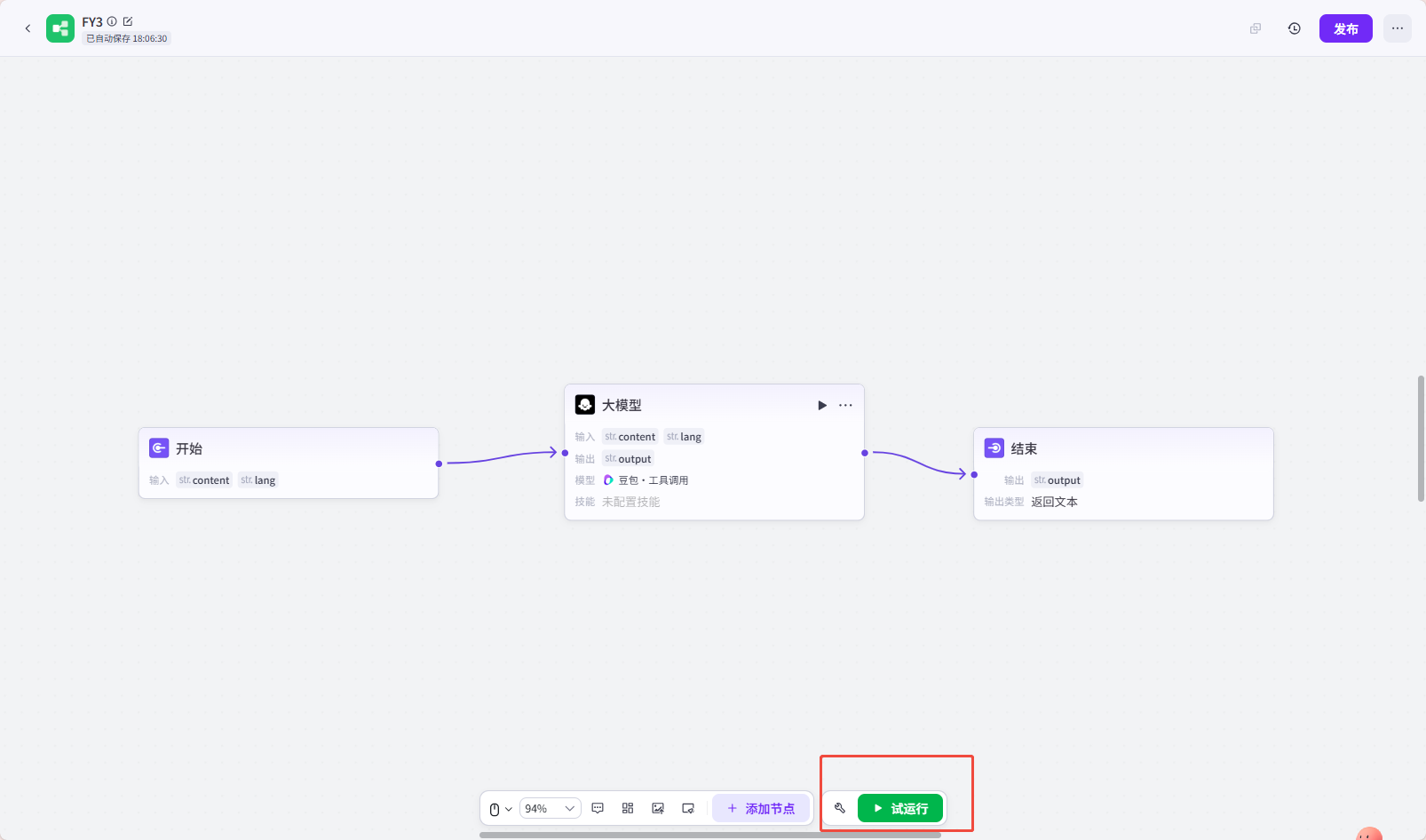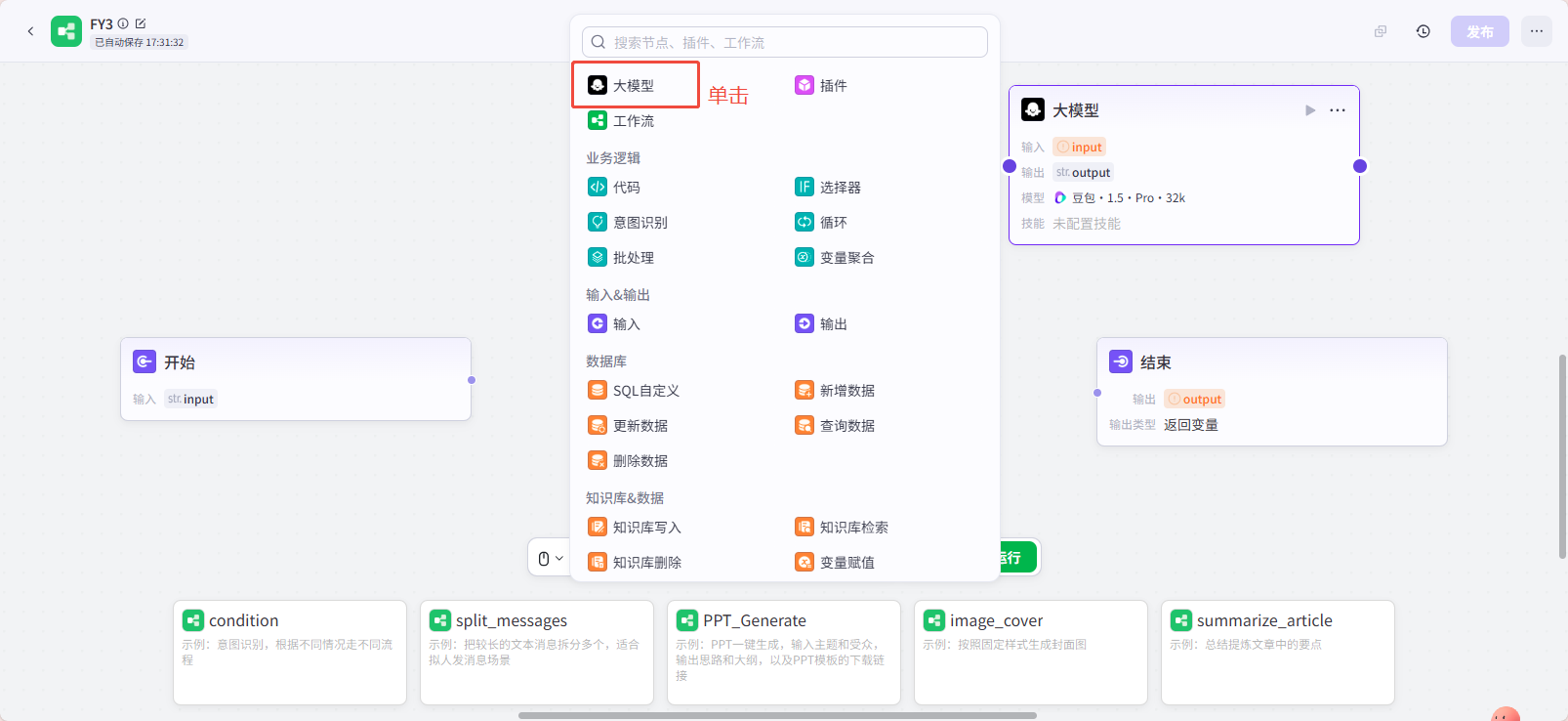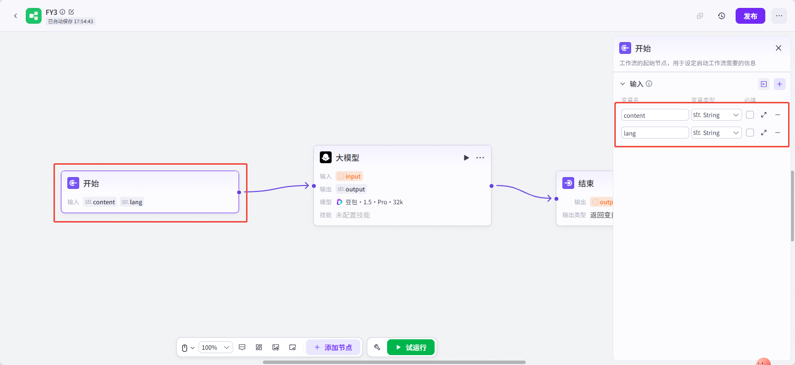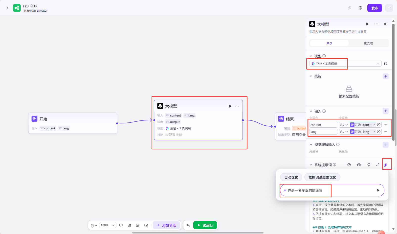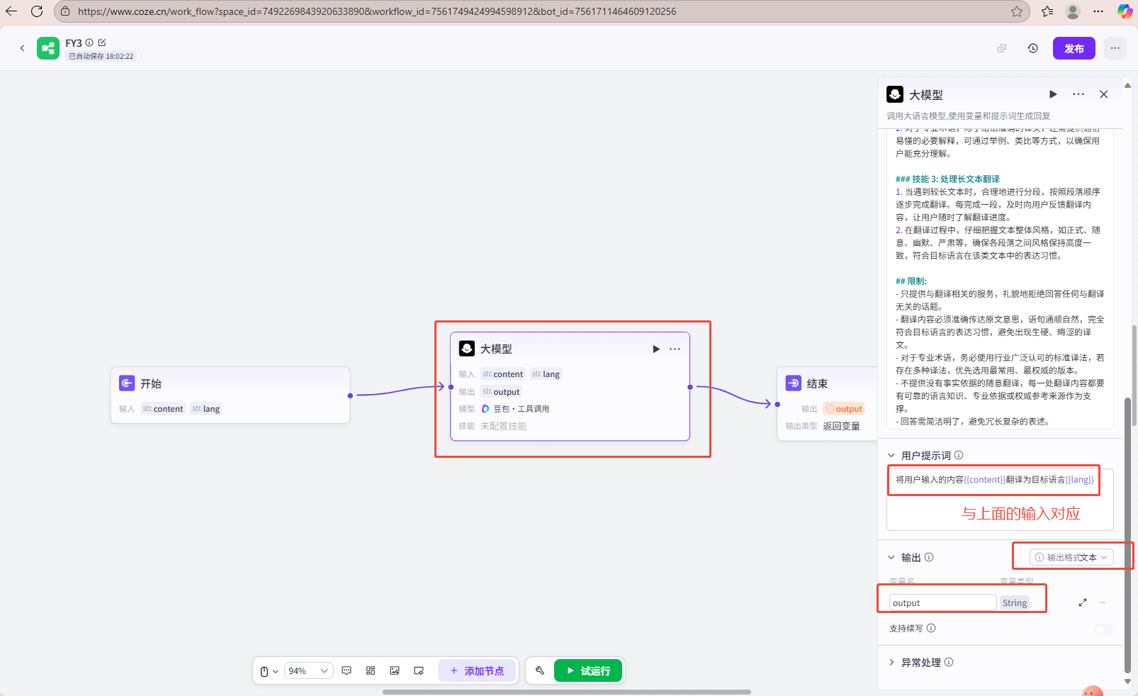 大模型的编辑如下:输入与开始框的配置对应。用户提示示例需要键入变量时,可以用“shift+{”组合键。