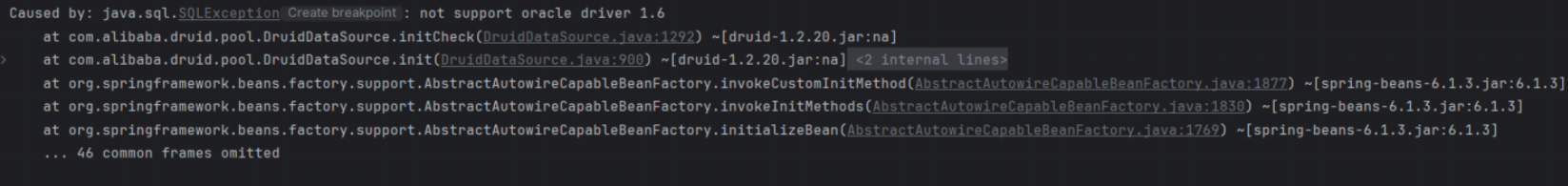 spring+druid连接池初始化时,要指定dbtype属性(由参数spring.datasource.druid.dbType指定)。但是druid目前不支持yashan,此参数的值又不能写成oracle。如果写成oracle,启动时会有如下异常: