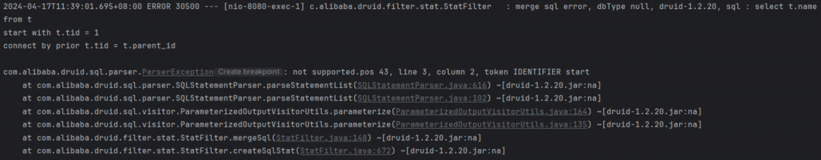 由于此异常对正常的业务流程无影响,忽略此异常或者关闭merge sql功能即可(设置spring.datasource.druid.filter.stat.mergeSql=false)
