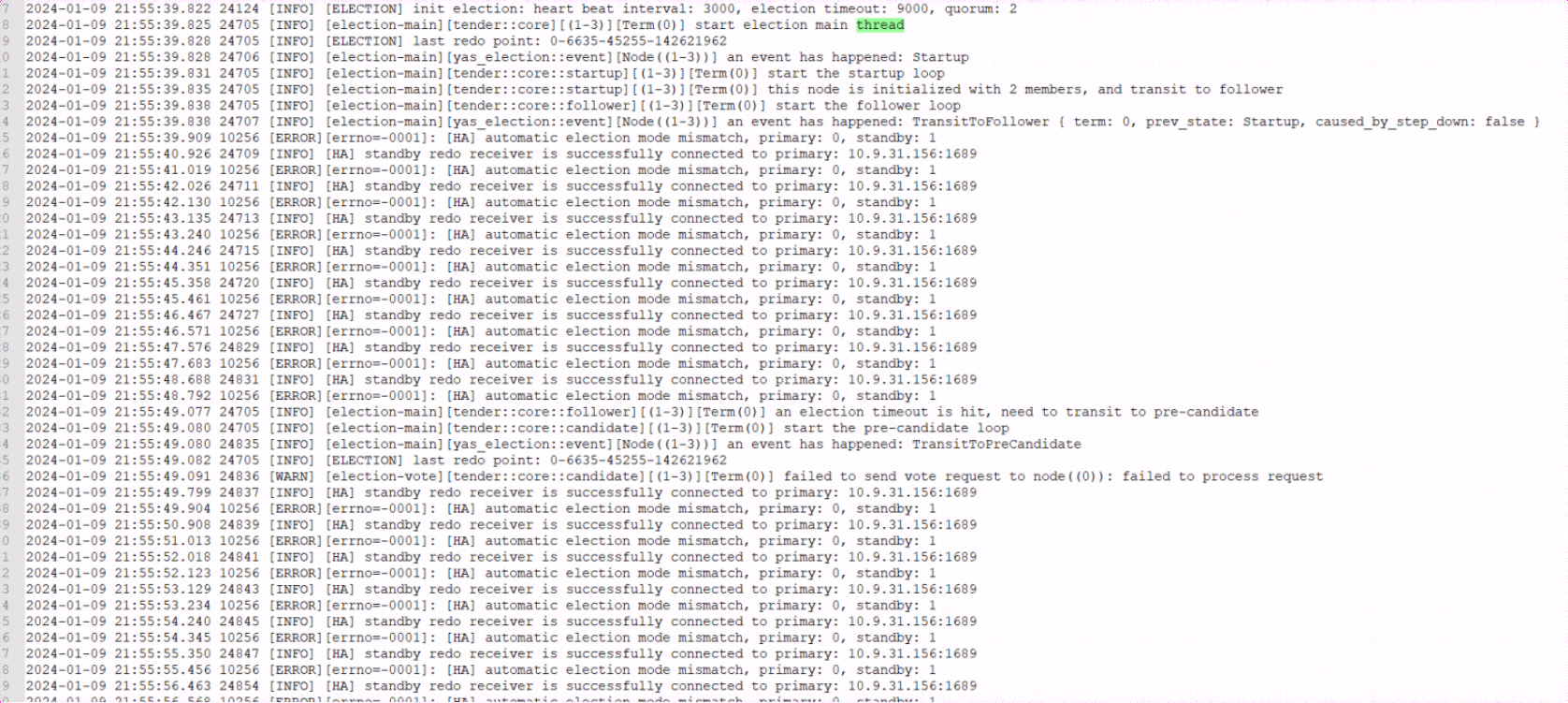 1、检查数据库日志,从run.log,可以看到数据库一直在做选举,且选举失败,主备状态一直异常。怀疑是选举参数配置有问题。