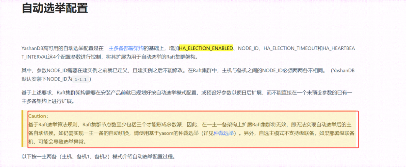 2、22.2.10及以下版本要使用自动选举需要部署一主多备(3个节点或以上)。节点少于3个,不能配置自动选举参数。