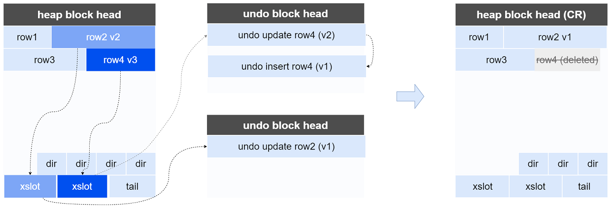 以HEAP block为例,当前Block上存在4个row,row2和row4对应的事务对当前查询SCN不可见,通过Xslot上指向的undo Row,找到对应的可见版本。