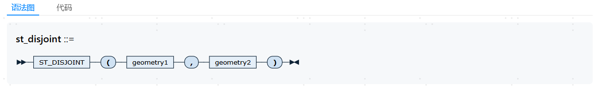 ST_DISJOINT函数的功能是判断两个Geometry是否不相交(无共同点),如不相交则返回TRUE,否则返回FALSE。