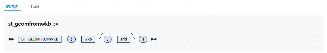 ST_GEOMFROMWKB函数根据给定的wkb(Well-Known Binary)和srid返回一个ST_GEOMETRY类型数据。