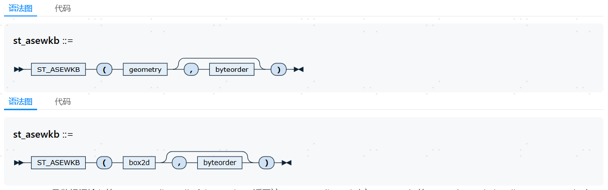 ST_ASEWKB函数根据输入的geometry(box2d)和byteorder,返回该geometry(box2d对应geometry)的EWKB(Extended Well-Known Binary)表示。
