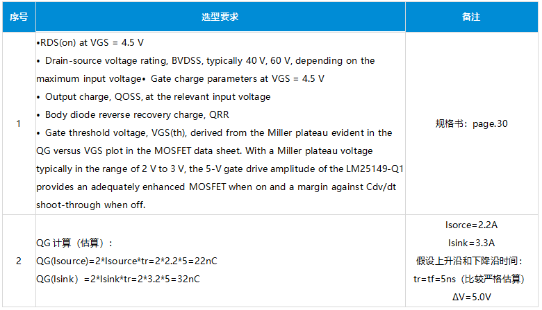 LM25149规格书没有过多的计算和选型计算,QG计算和选型根据经验估算倒推,计算结果选择4.5-5.0V Vgs,≤22nC,计算过程参看下表,选择米勒平台为2-3V(接近3V也可以接受),Rdson选择≤8mΩ。