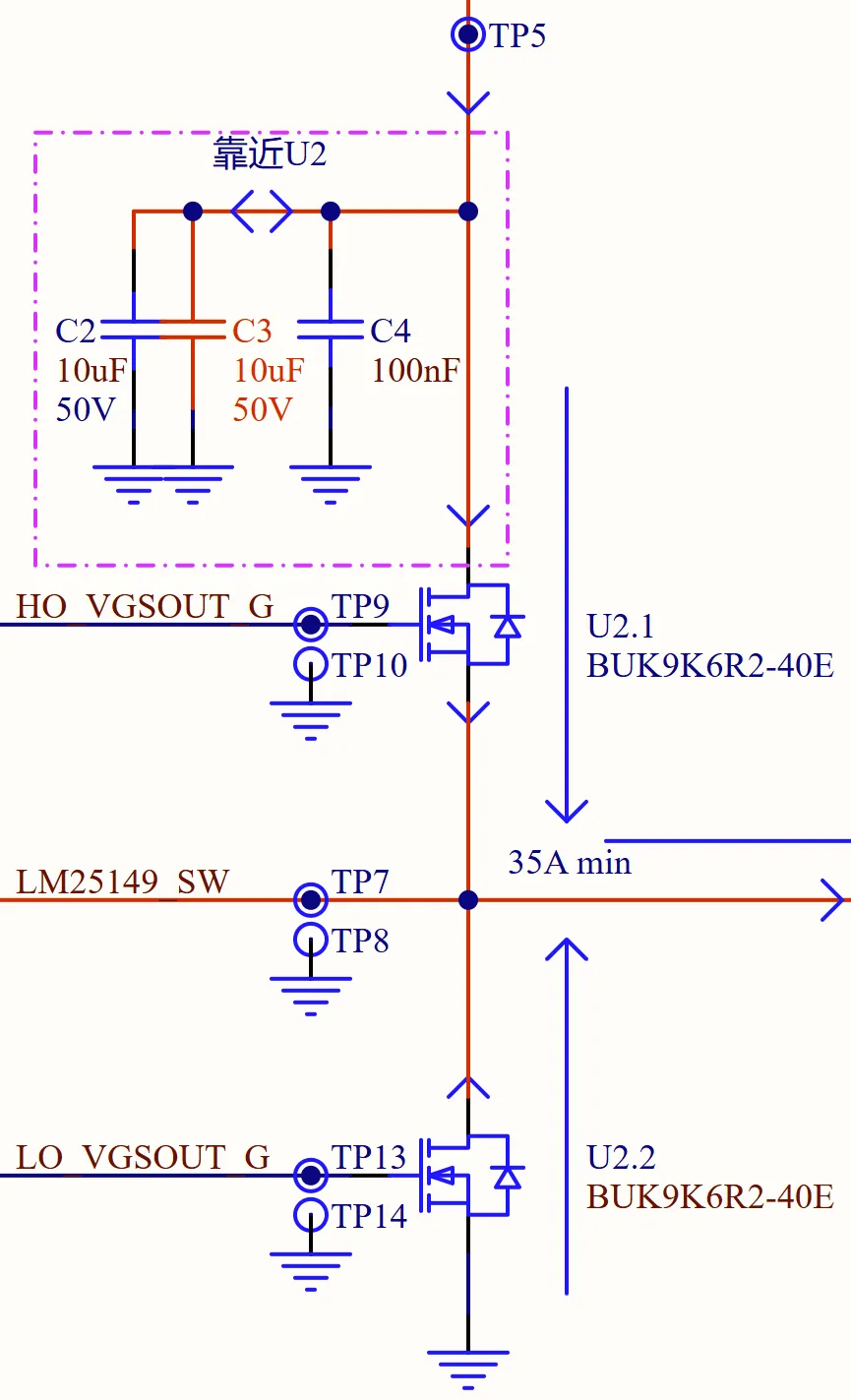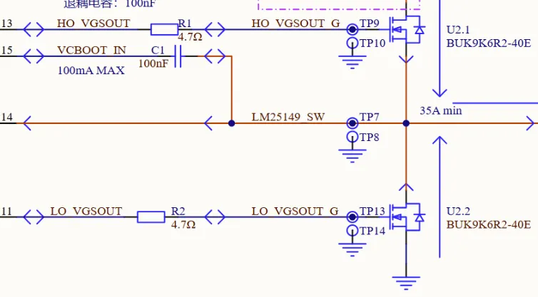 对于功率MOSFET和LM25149输入电容退耦电容具有相同要求,本设计未用于性能验证,使用单个陶瓷,产品级设计要遵循汽车级设计要求。
