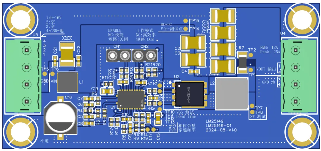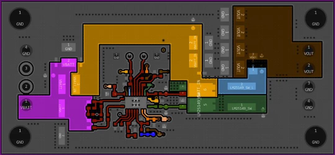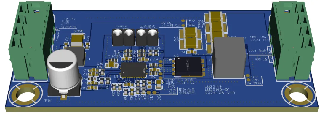 本设计使用LM25149设计域控制器一级电源,能够满足瞬态电流24A(100us)要求,并满足稳态工作10A以上的工作要求,做到体积,成本,性能综合平衡。