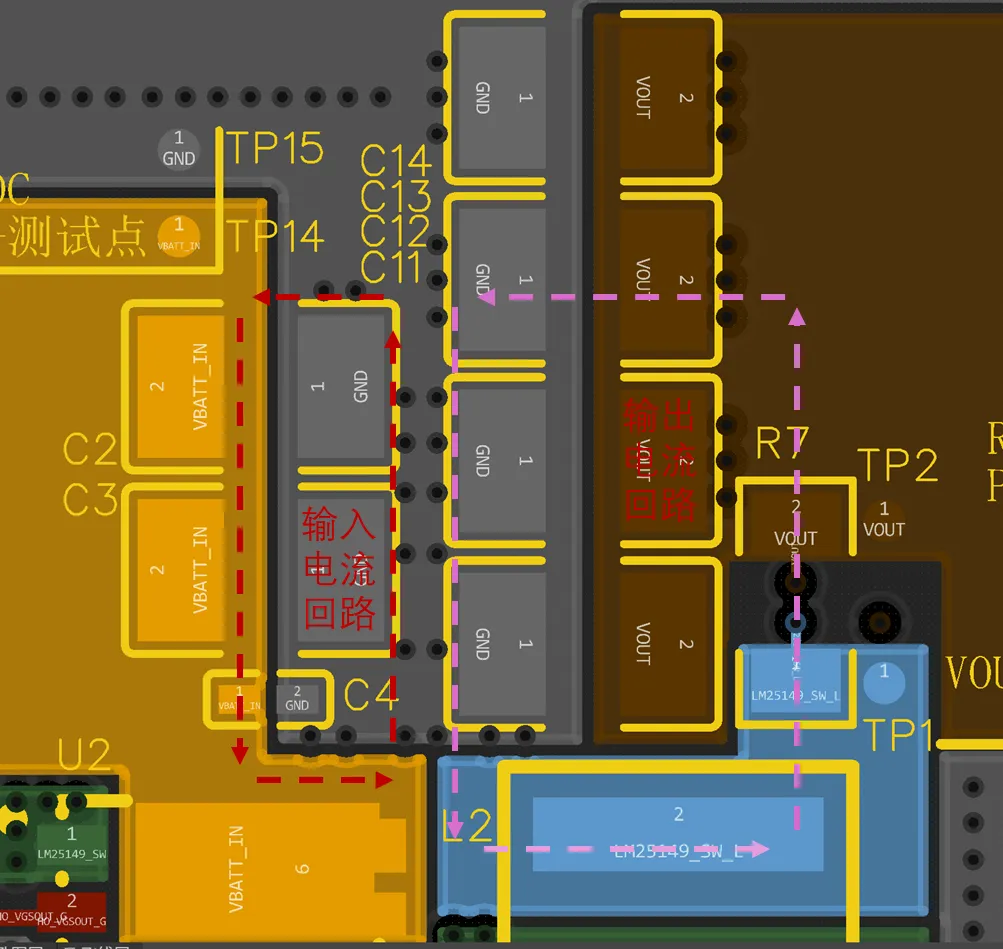 C2,C3,C4,Layout需要注意电流环路(参考Layout细节),符合基本的BUCK电源输入电容要求和设计理论,可以学习BUCK开关电源理论深化对输入电容理解。
