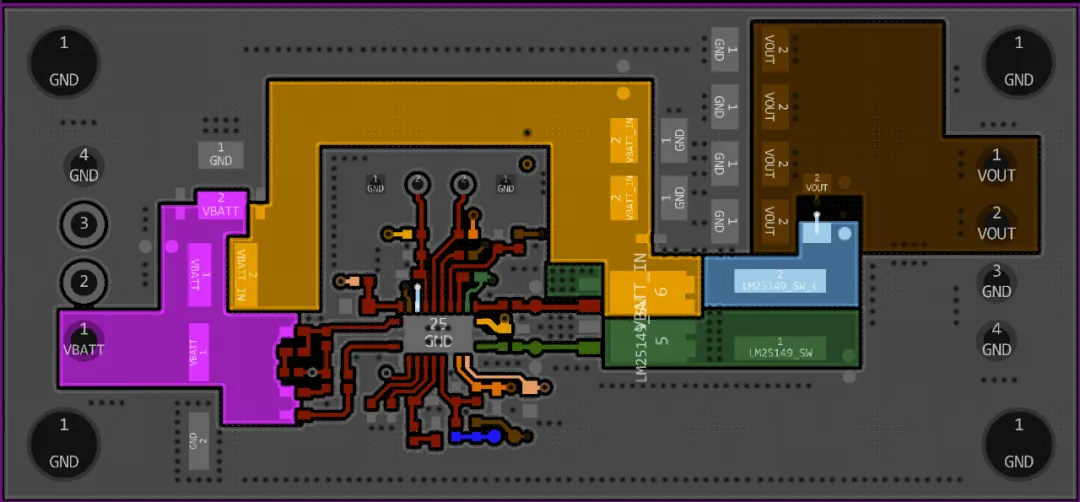 发热器件:MOSFET、电感和采样电阻,可以适当增加平面面积传导热量,增加GND过孔可以帮助提升整版散热条件。