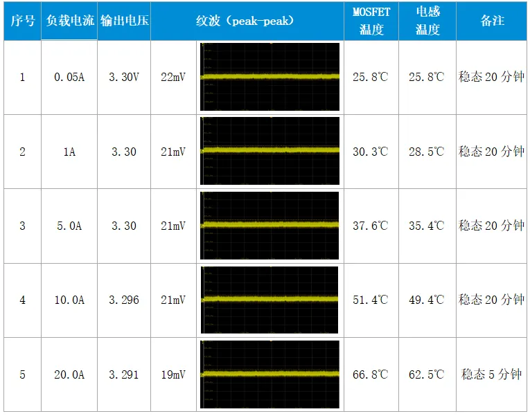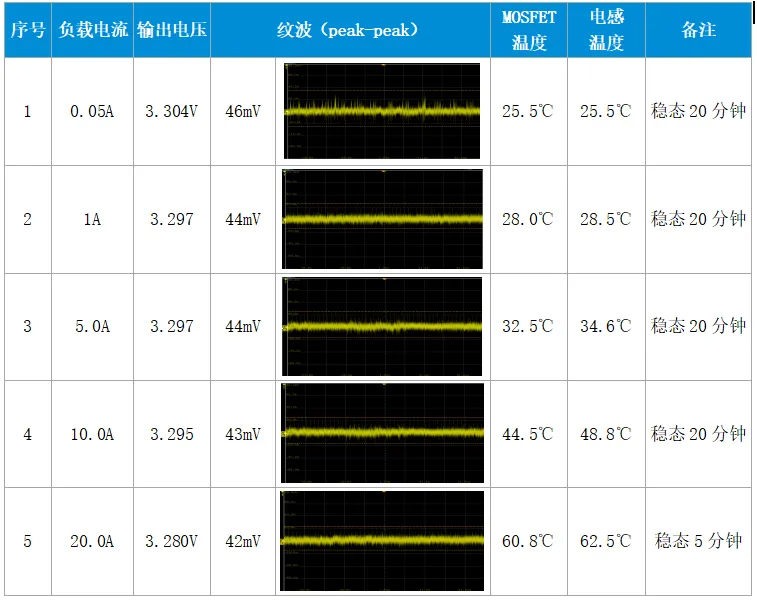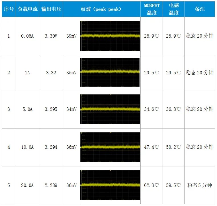 验证不同电压(9-16V)稳态负载能力表现出来的纹波、电压精度、稳定性、温升、效率等性能,限于篇幅,挑选性能主要指标测试验证。