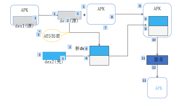加壳是在原来apk的基础上加一层保护壳,dex文件修改了就需要重新打包,否则apk安装不了。这就需要我们详细学习apk如何打包的