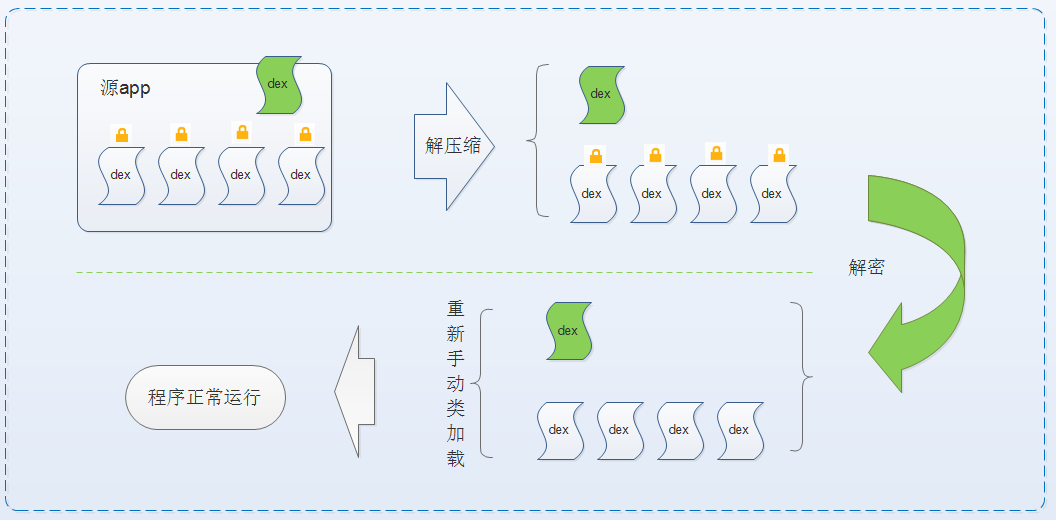 加壳后的文件是不能直接用的,dex文件是加密的,所以我们需要对他进行解密,解密后的dex文件如何加载?