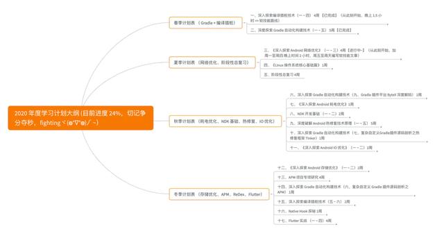 然后,我们再根据需要掌握的技能点分别制定完善的学习计划。最后,我这里将 「2020 年的学习计划大纲」 正式公开,思维导图如下所示: