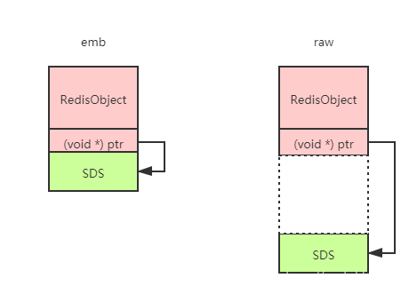 如图所示,emb 存储形式它将RedisObject 对象头和 SDS对象连续存储在一起,也就是使用malloc方法一个分配来存储。而raw 却不同,RedisObject 和 SDS分开存储,在内存中并不连续,需要两次malloc方法分配内存。