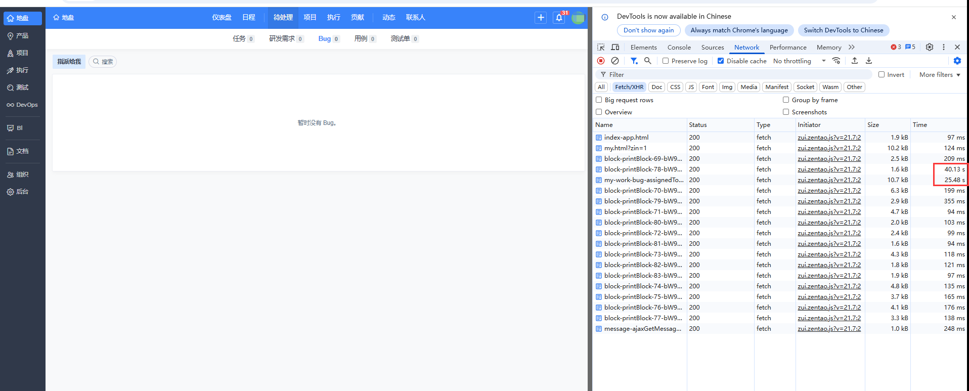 如图所示,在访问禅道时,某些请求(比如图中耗时很长的接口请求)需要等待数十秒甚至更久,严重影响了工作效率。