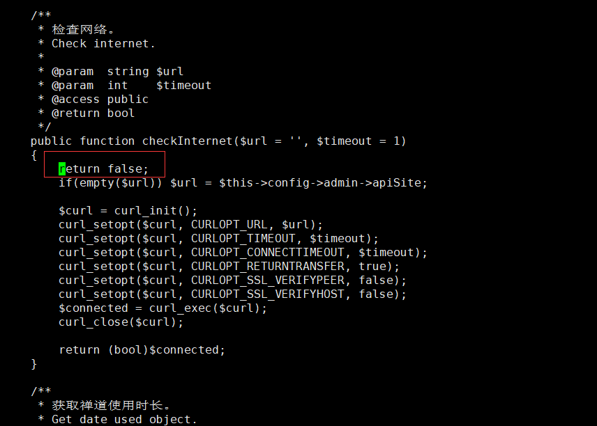 checkInternet 方法的作用是检查禅道是否能连接到外部网络,在一些场景下,这个检查并非必需,而且会因为网络问题拖慢系统响应。通过强制让该方法返回 false,跳过了耗时的网络检查过程,从而提升禅道的访问速度。