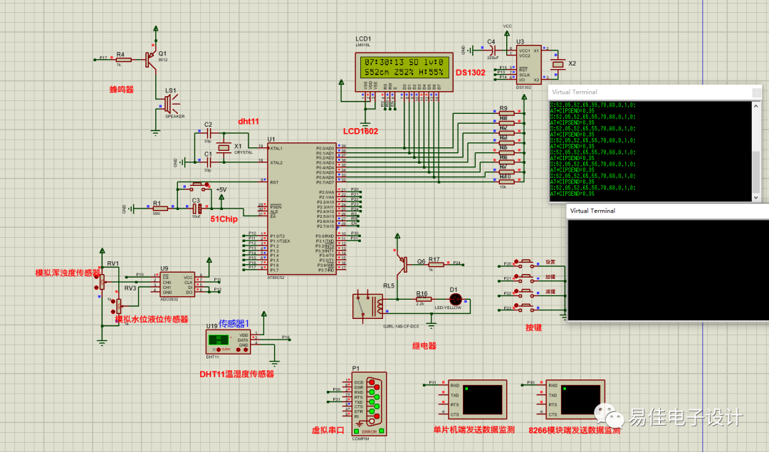 1.通过湿度传感器、水位传感器、浑浊度传感器进行数据检测。