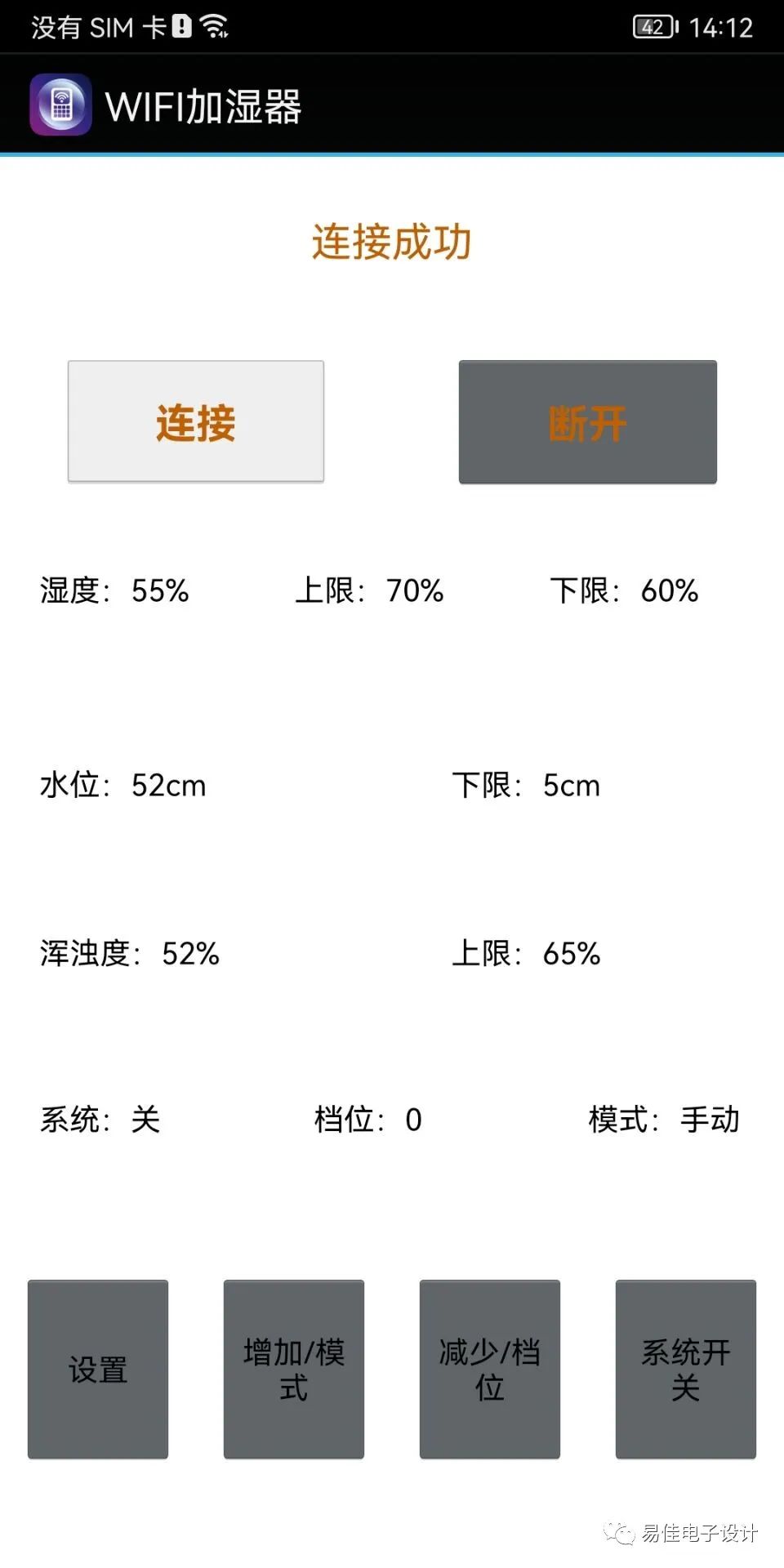 主要针对环境湿度情况,智能化、便捷化的家用智能加湿器控制系统,可以自动检测室内湿度,调节加湿档位。可以自动检测水位,低于阈值报警。可以检测加湿器内水的浑浊度,高于阈值报警。设置液晶显示器,显示检测的各参数值。可以增加时钟模块,能设置定时开关机,增加手机APP显示湿度,水位,浑浊度,可以远程调节控制加湿档位,开关机。