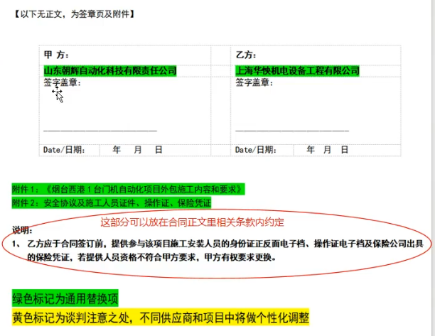 附件目录及附件页,附件目录附上(之前讲过的所有额外证明验收用或凭证类)这些附件可能包括报价单、技术协议、相关图纸、资质证明、照片等,严格按照附件目录所列顺序依次附在合同后面!