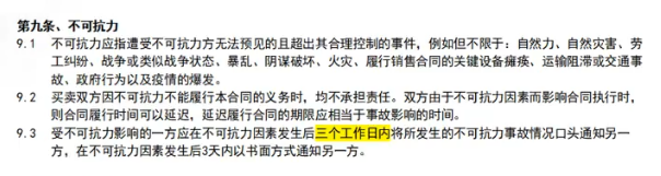 当发生不可抗力后双方应采取的措施,可免承担的责任以及合同继续执行的方式;出现不可抗力时,需要规定在n天内将情况及时通知另一方,口头和书面都要做,书面一般要晚于口头。