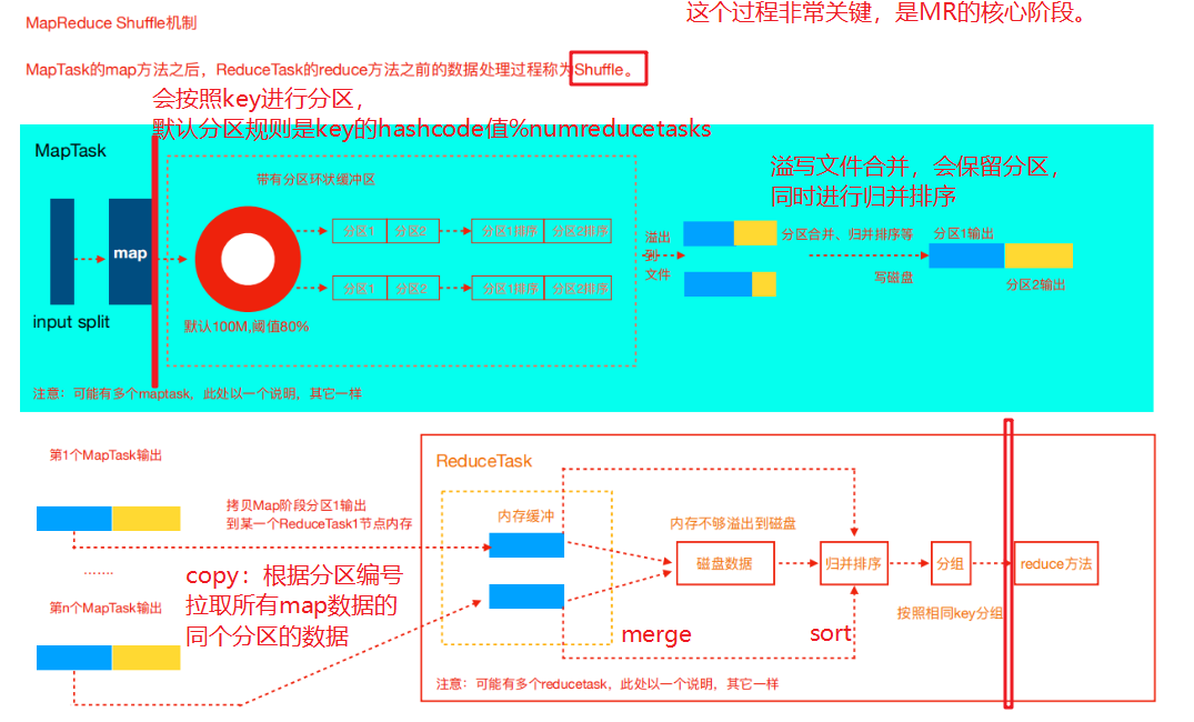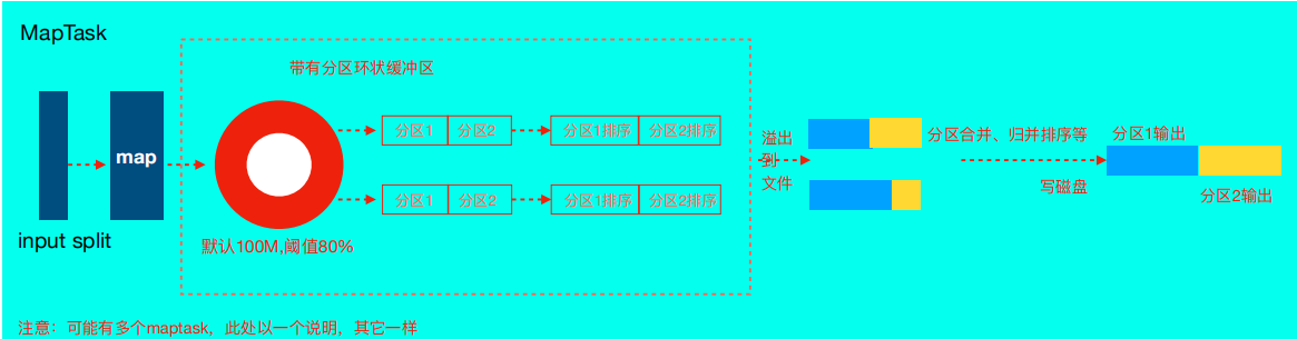 7. 合并溢写文件:每次溢写会在磁盘上生成一个临时文件(写之前判断是否有 combiner ),如果map的输出结果真的很大,有多次这样的溢写发生,磁盘上相应的就会有多个临时文件存在。当整个数据处理结束之后开始对磁盘中的临时文件进行merge 合并,因为最终的文件只有一个,写入磁盘,并且为这个文件提供了一个索引文件,以记录每个reduce 对应数据的偏移量。至此 map 整个阶段结束 !!